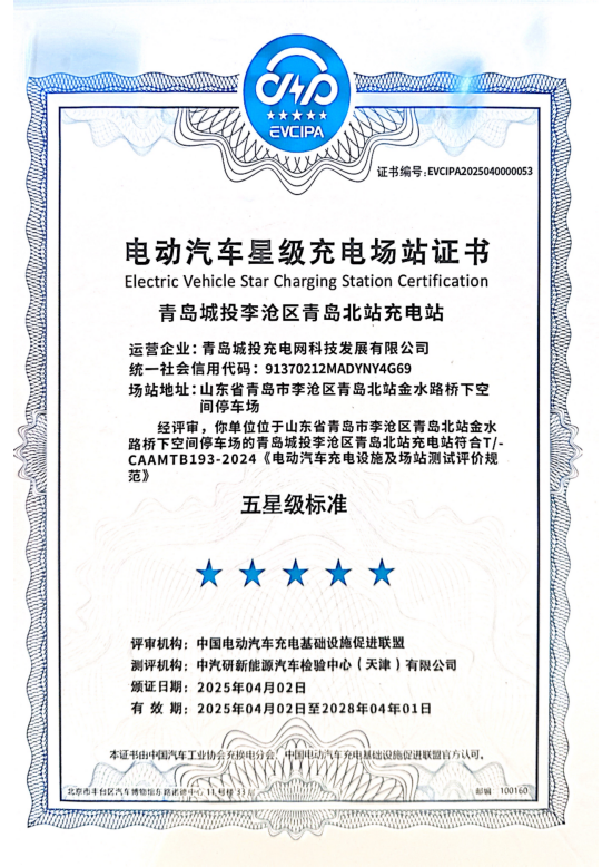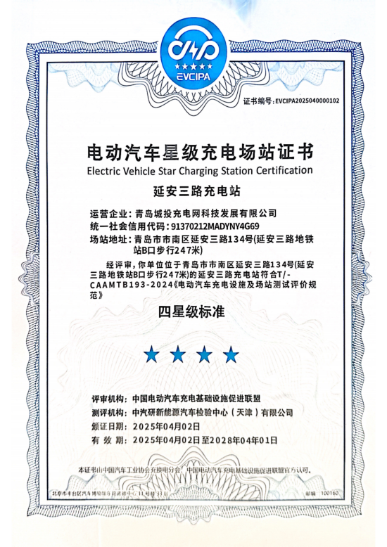 4月2日,中国电动汽车充电基础设施促进联盟(以下简称“中国充电联盟”)2025年度工作会议在杭州召开。活动期间,中国充电联盟公布了2025年星级充电场站名单,青岛开云(中国)充电网旗下青岛北站、延安三路两座示范站点获评星级充电站。