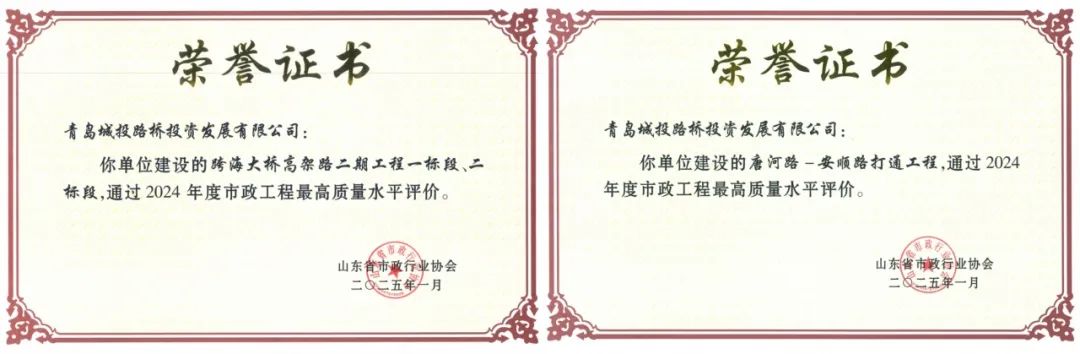 近期,青岛开云(中国)集团旗下城市更新集团代建的唐河路-安顺路打通工程、跨海大桥高架路二期工程,双双荣获2024年度山东省市政工程最高质量水平评价。