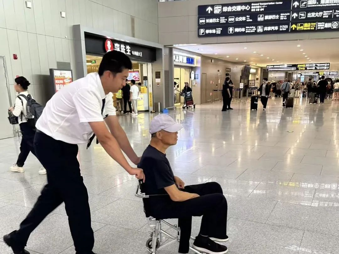 彼时机场中转柜台因保障量大,仅剩客舱轮椅可用。赶来支援的地面服务人员飞奔向柜台取来轮椅,细致检查了扶手、座椅等关键部位。回到休息区,他蹲下身子,轻声向老人解释:“虽然轮椅小了点,但我推着肯定稳当,咱放心走!”